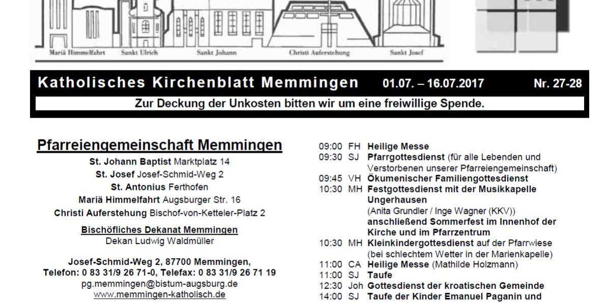 Hier finden Sie das aktuelle Kirchenblatt mit allen Zeiten für Gottesdienste, Gebetszeiten, Beichtgelegenheiten, Veranstaltungen, Gruppenstunden usw. für den Zeitraum 01.07. bis 16.07.